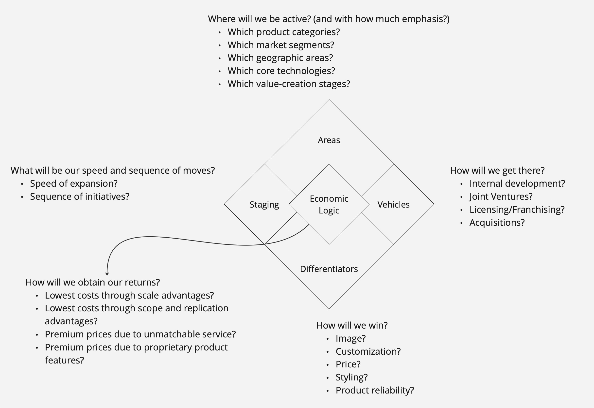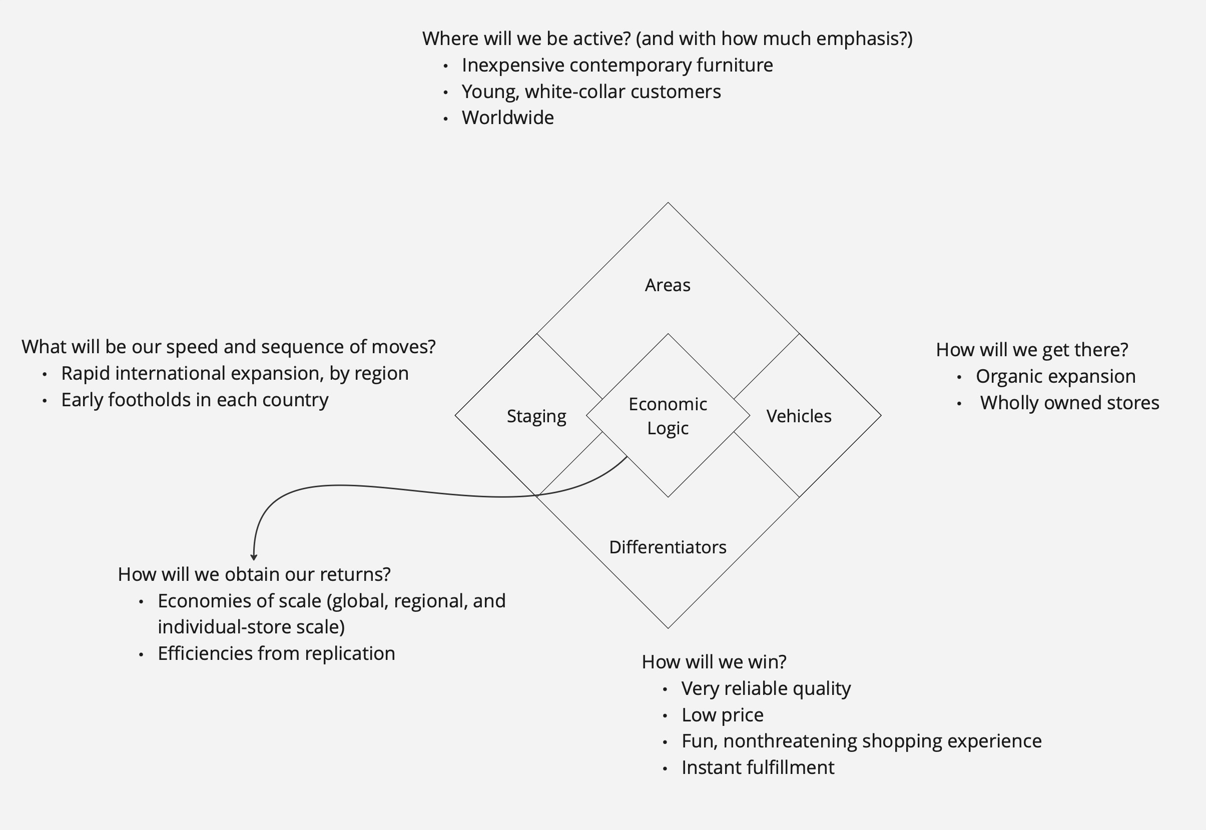 - Are the elements of your strategy internally consistent? Have you made choices of arenas, vehicles, differentiators, and staging, and economic logic? Do they all fit and mutually reinforce each other?