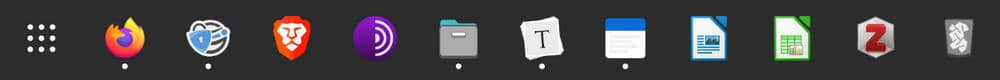 An assortment of browsers: Firefox being my daily driver along, Iridium for when I want a Chromium feel, Brave for work and Tor for when I am in full tinfoil hat mode. Typora my current markdown editor. Standard Notes for... notes. LibreOffice and Zotero for my research projects. What's on your plank?